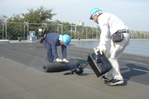 断熱材を使用した防水工法です。断熱材は、露出防水では防水層の下に、押さえ防水では防水層の上に張り付けます。断熱材を使用した、省エネ対応の工法です。